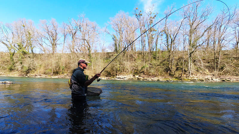 On appliquera le Toc Pyrénéen : technique de la dérive naturelle. L’appât doit évoluer au ras du fond et être transporté par le courant. Le positionnement doit respecter la perpendicularité à la veine d’eau, légèrement en amont du poste visé. Lancez en amont (~1 à 2 mètres en général) pour laisser l’appât traverser la colonne d’eau puis se poser. Maintenez la canne en surplomb, sans retenir la dérive. La touche est visuelle et le ferrage instinctif : la ligne se décale, freine, bloque ou recule. Surtout, ne vous fiez pas uniquement au «toc» sous peine d’oublier beaucoup de touches !